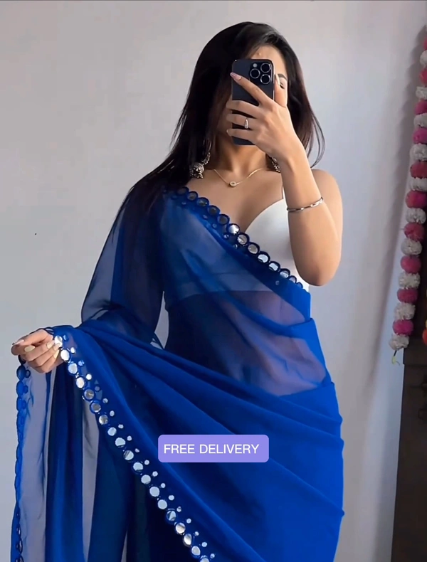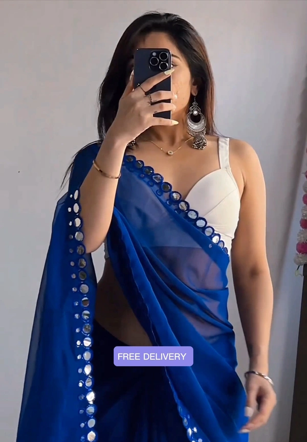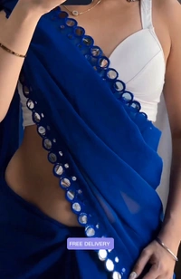 This is a Faux Georgette Plastic Mirror work Party Wear Saree.This Saree comes with an attached Art Silk blouse fabric which can be customised from 32" to 42